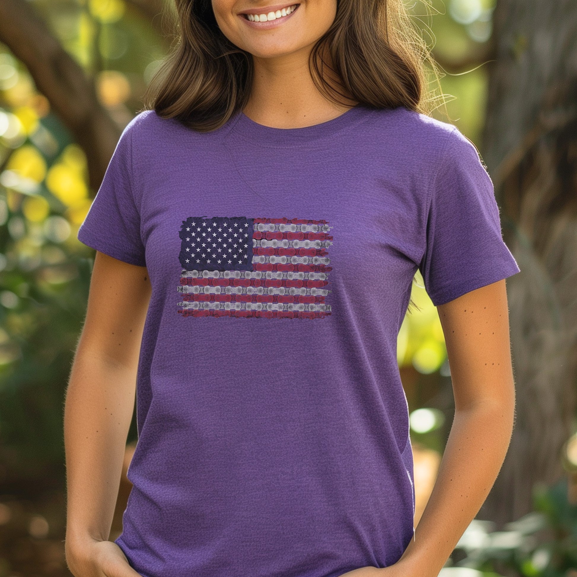 A simple cycling t-shirt that shows your love for the US - this shirt has an American flag made out of bike chains, perfect for any cyclist!