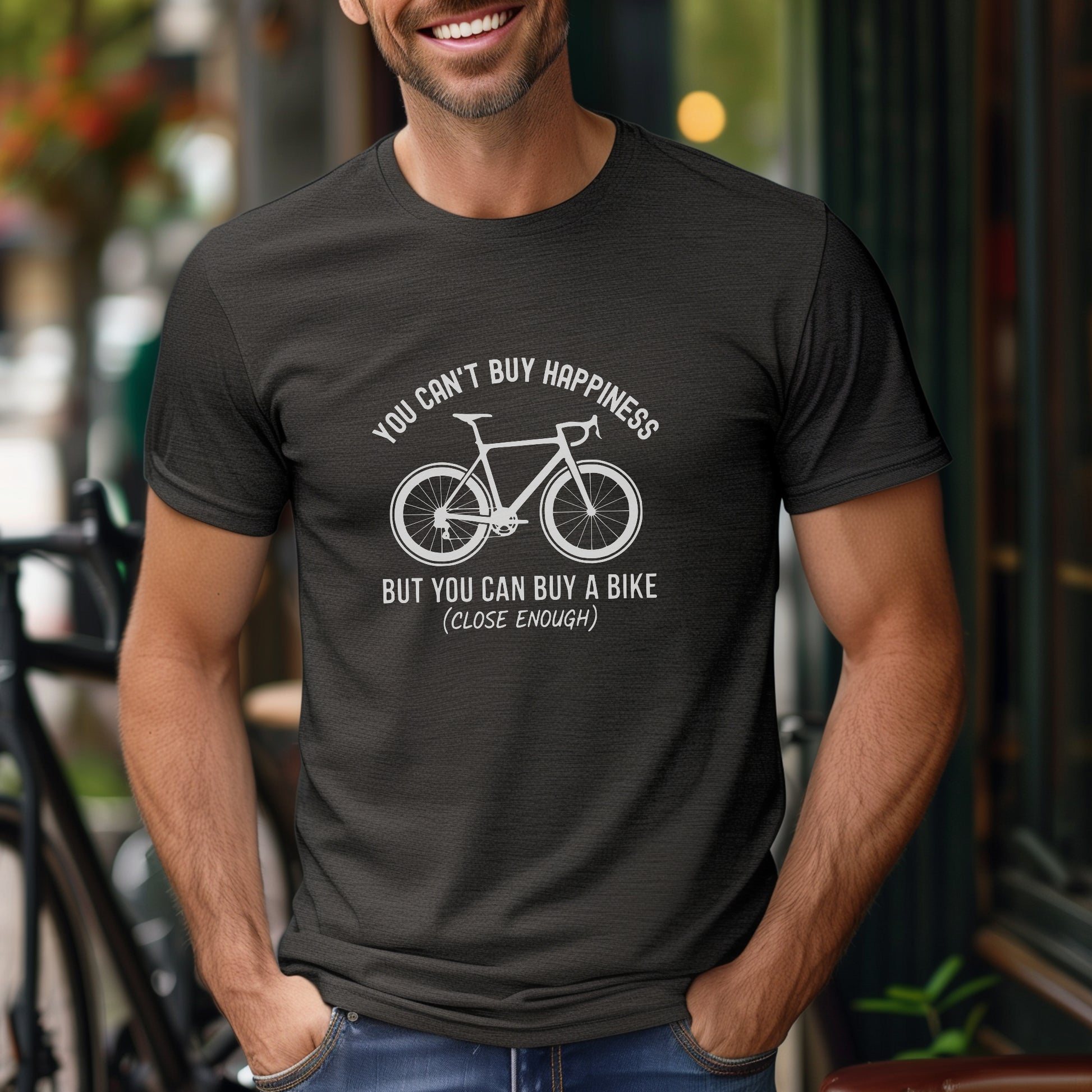 Bikes, especially new bikes, are hard to beat in terms of bringing happiness. Send others this message with this fun cycling t-shirt.