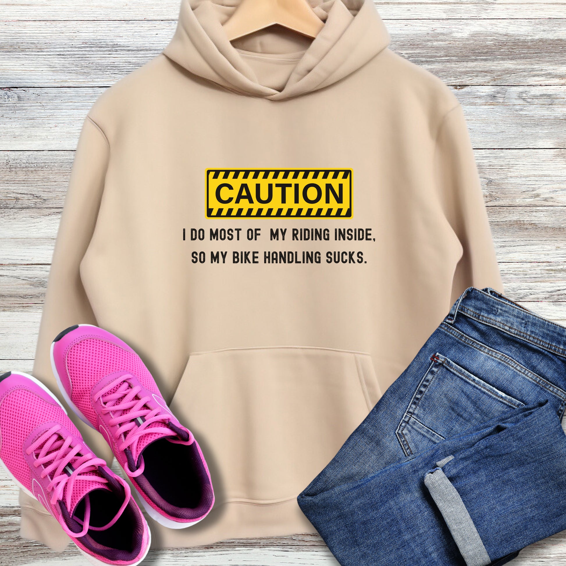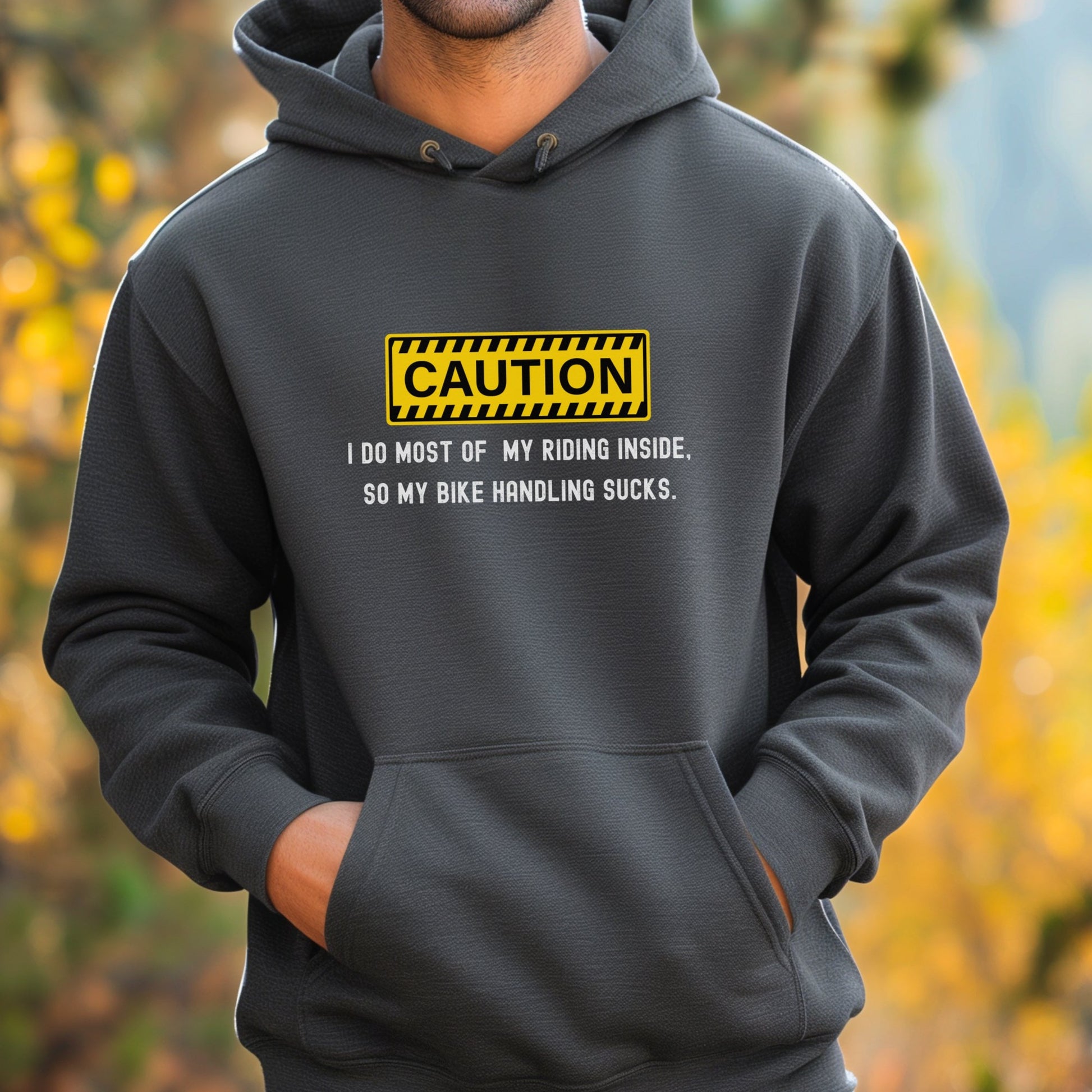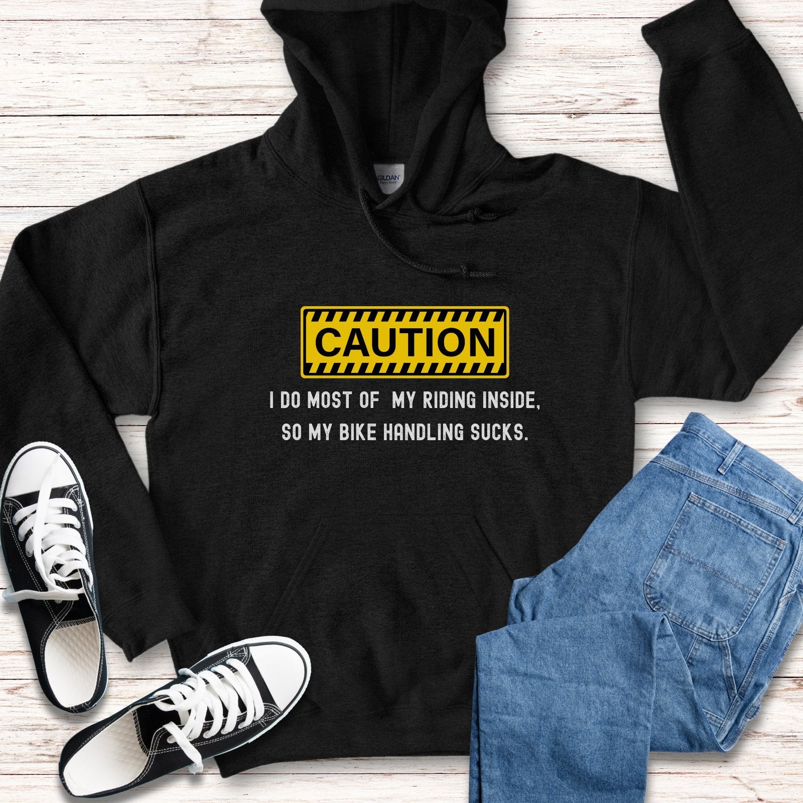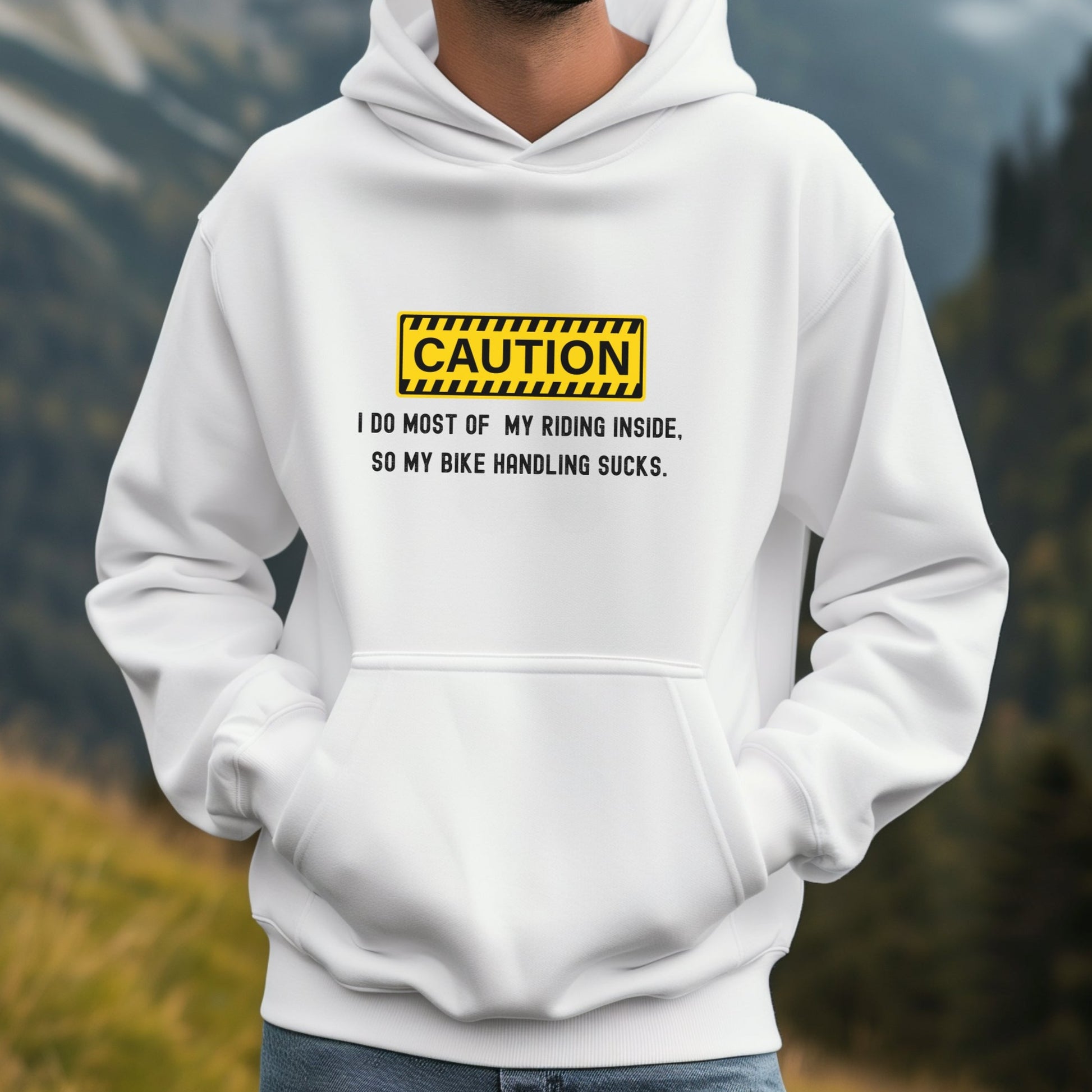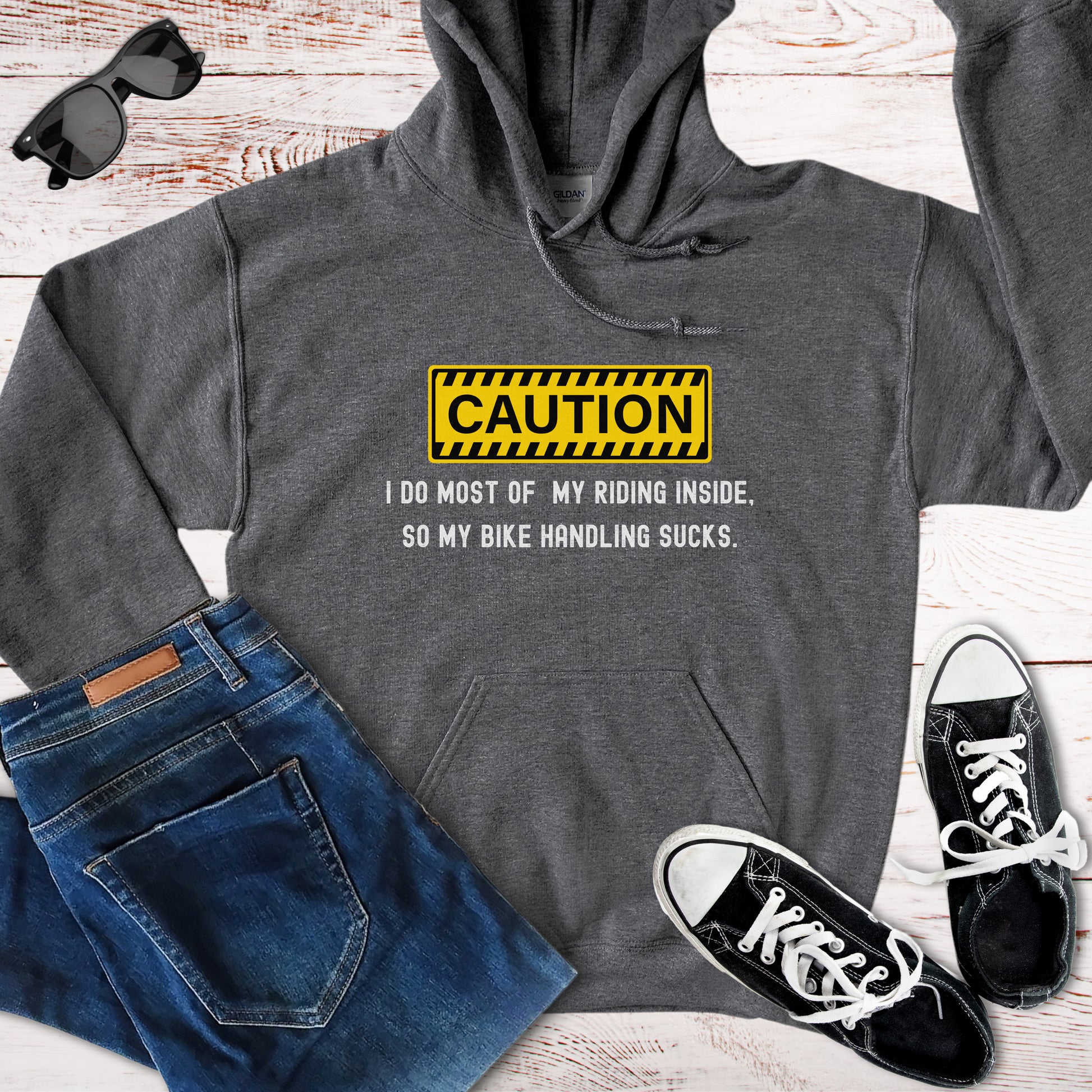 This funny cycling hoodie speaks to the lack of handling skills that many have, especially triathletes. These days, a lot of cyclists and triathletes are spending much of their time riding indoors on various cycling apps. As a result, the handling skills that are learned from riding outdoors are a bit lacking. This sweatshirt speaks to this fact.
