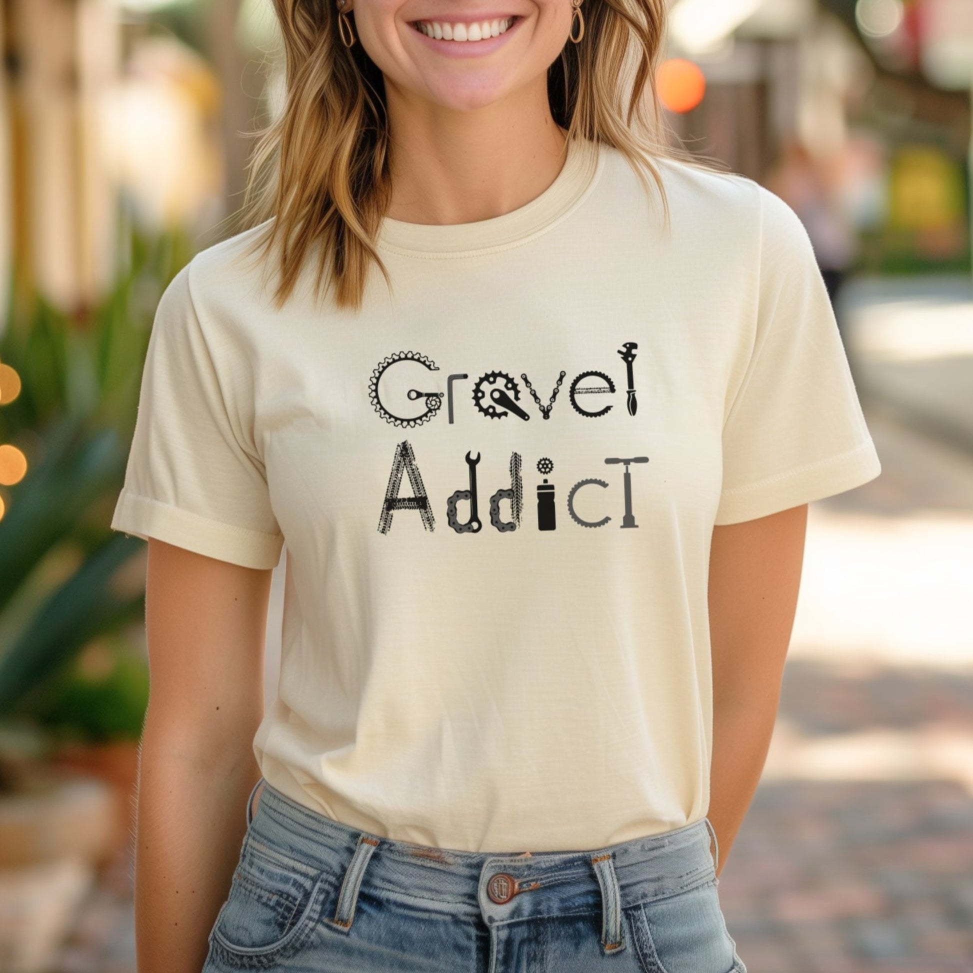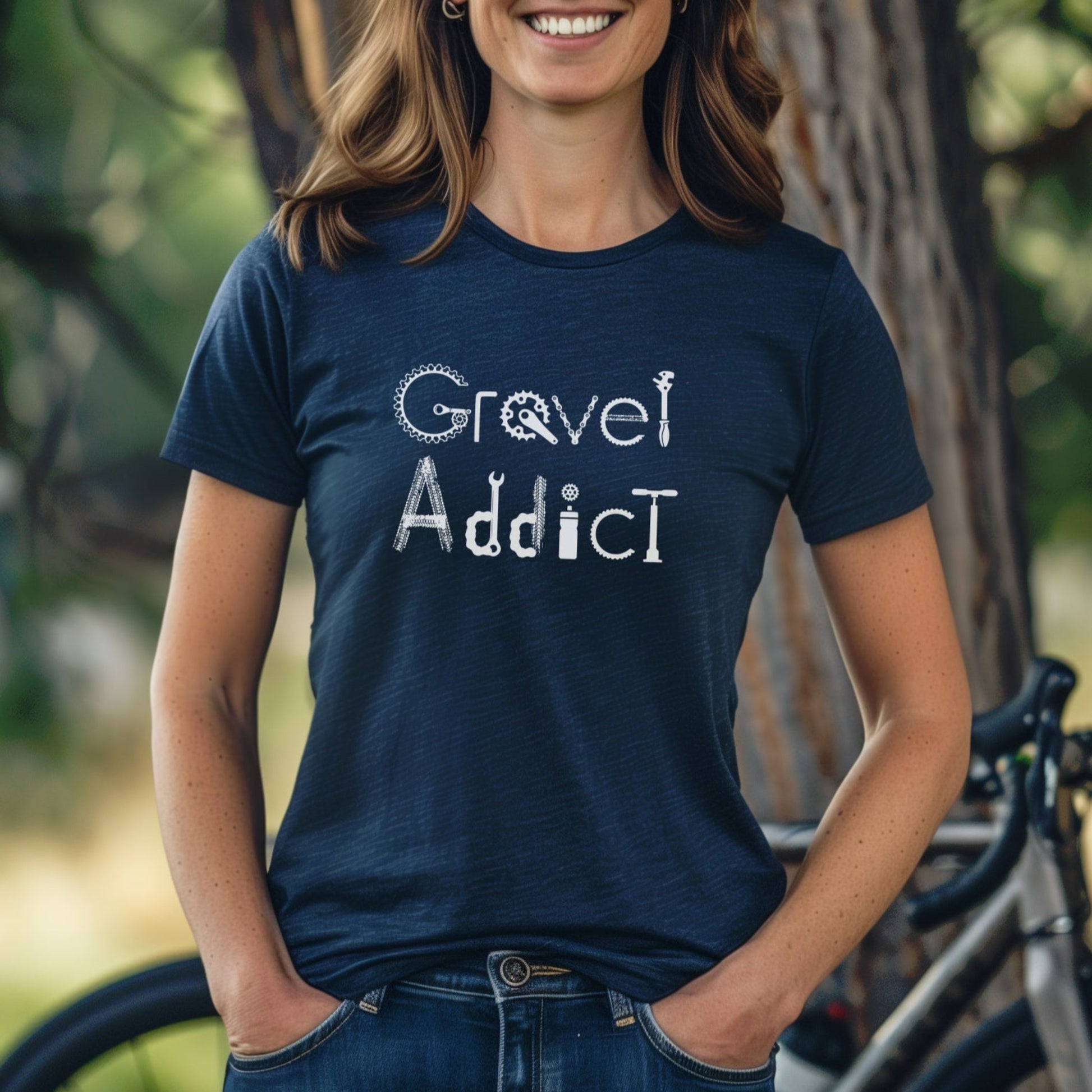 This cycling t-shirt is perfect for gravel enthusiasts! "GRAVEL ADDICT" is cleverly designed with each letter made from bike parts like chains, gears, tires, and tools, celebrating your love for adventure on two wheels in a unique and creative way.