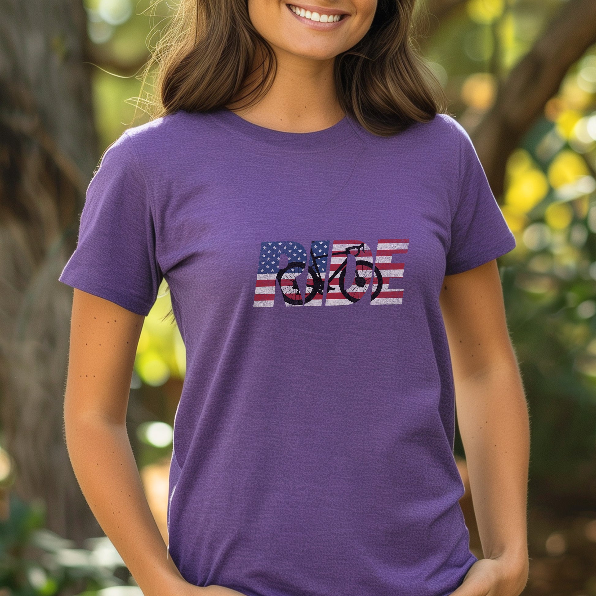 This cycling shirt features an American flag design with a road bike, letting others know what you love.