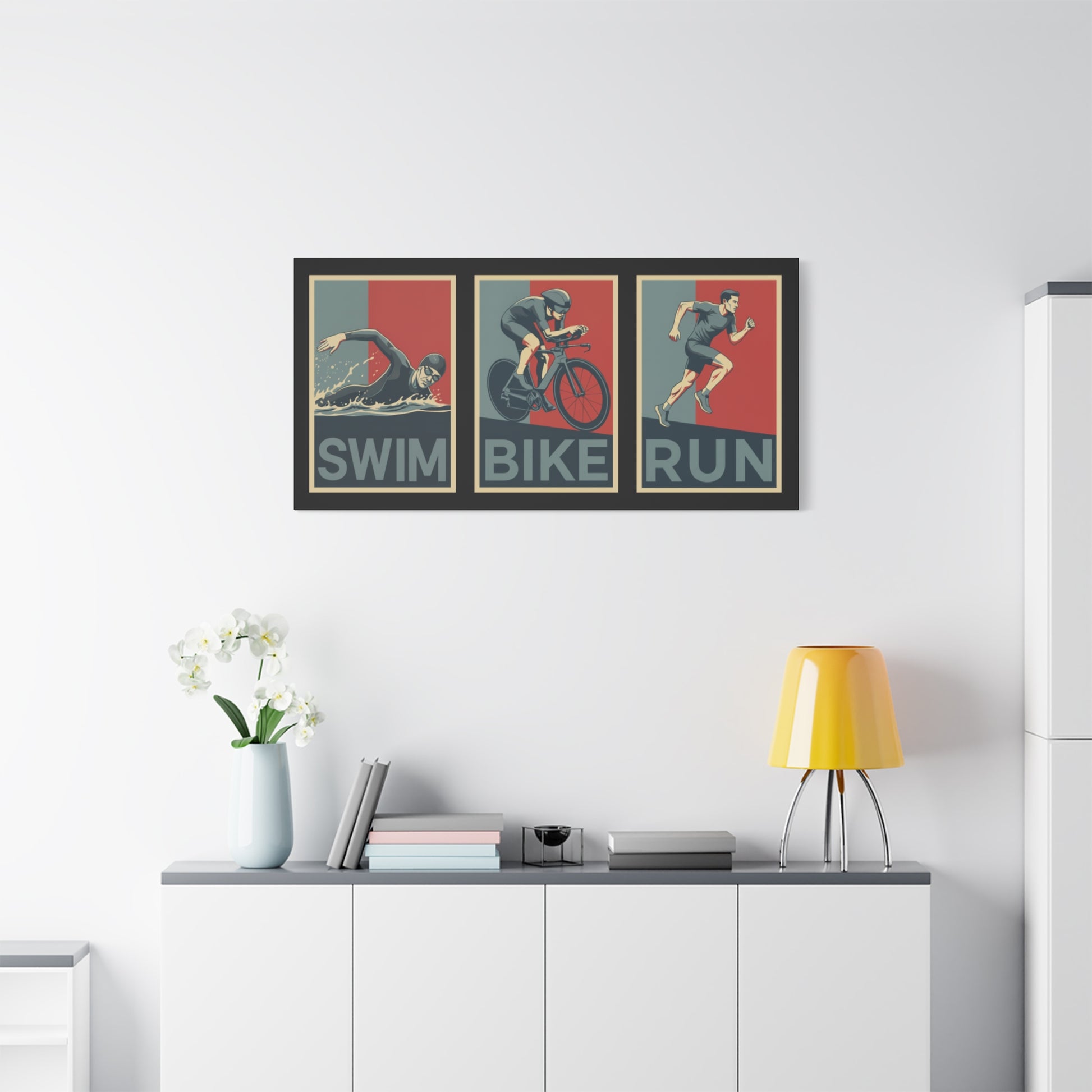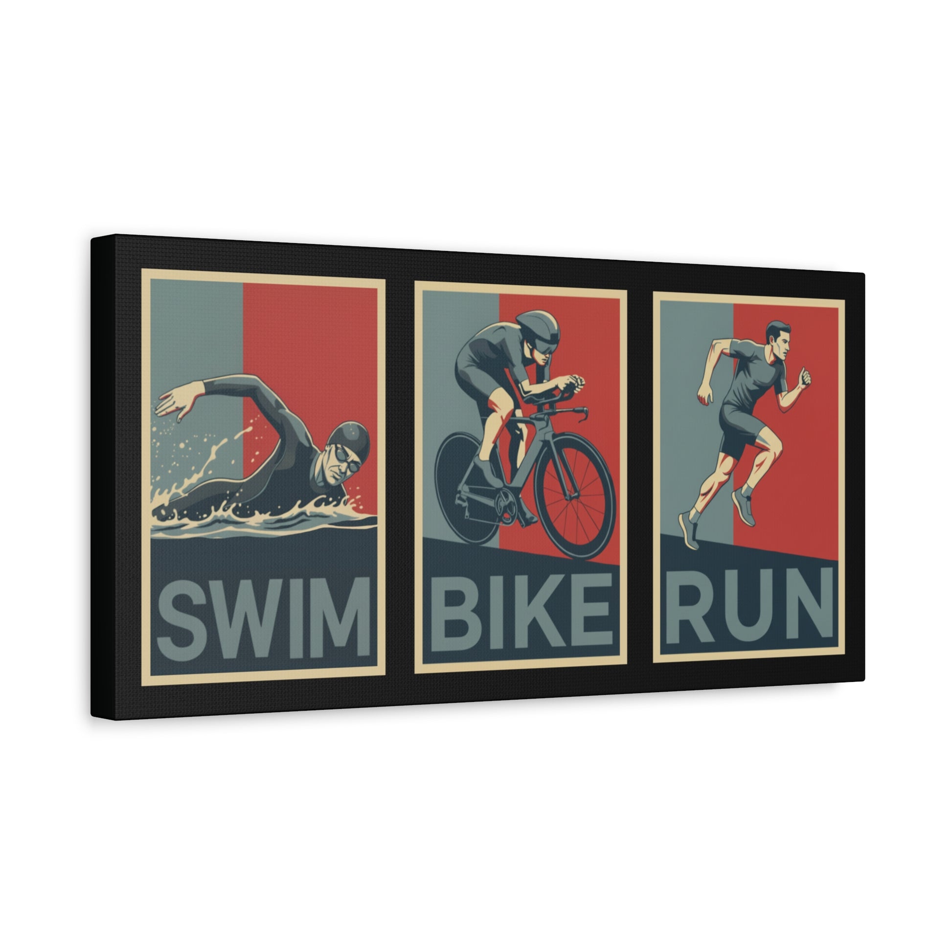 Bring your triathlon lifestyle to life with this canvas art piece for male triathletes. Whether it’s your home gym, office, or pain cave, this retro poster-style canvas will stand out.