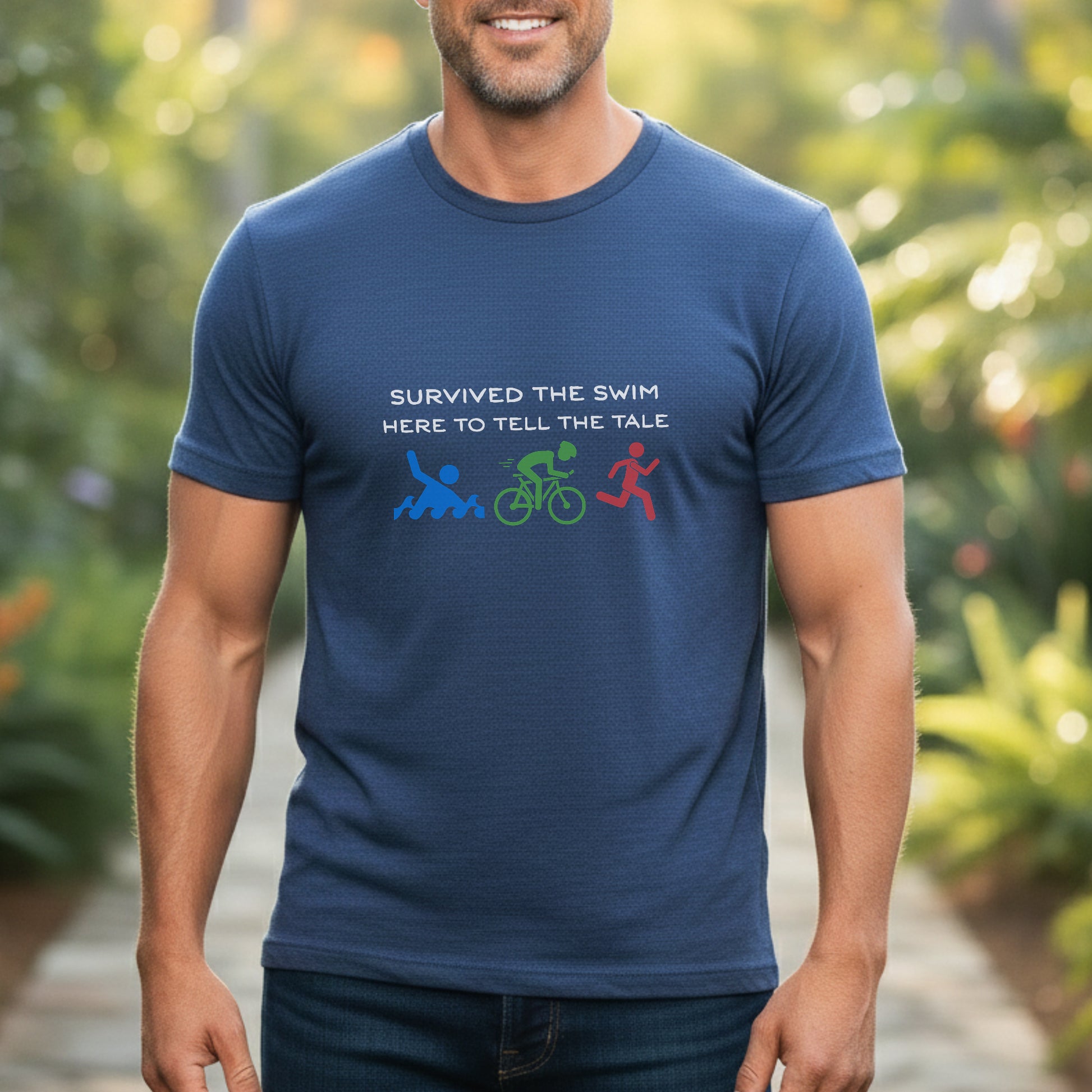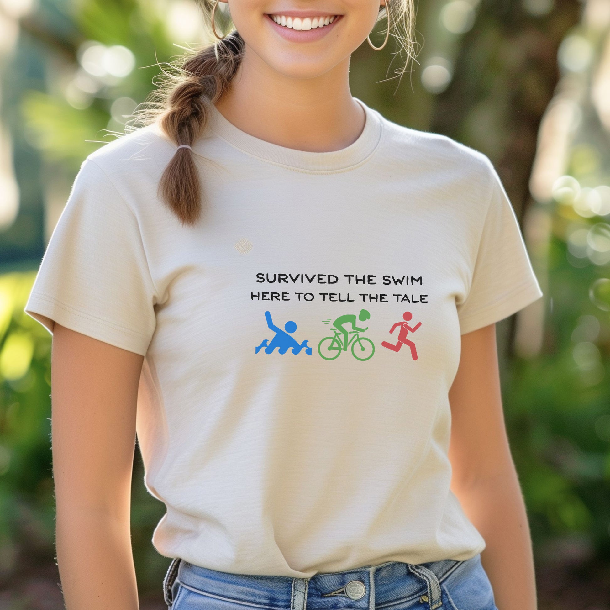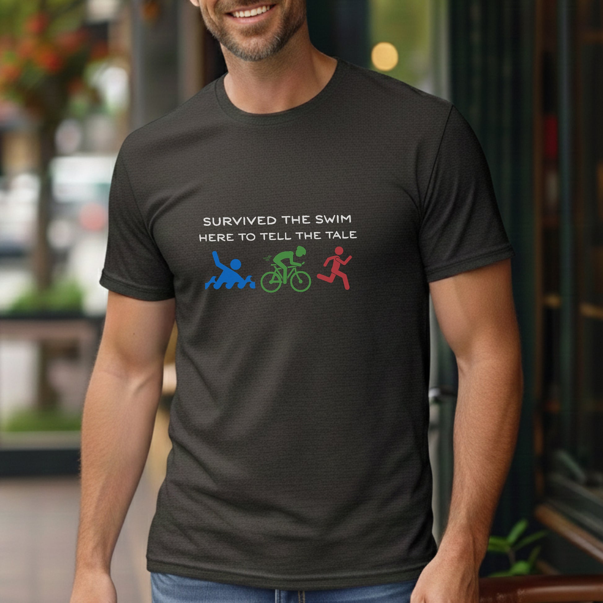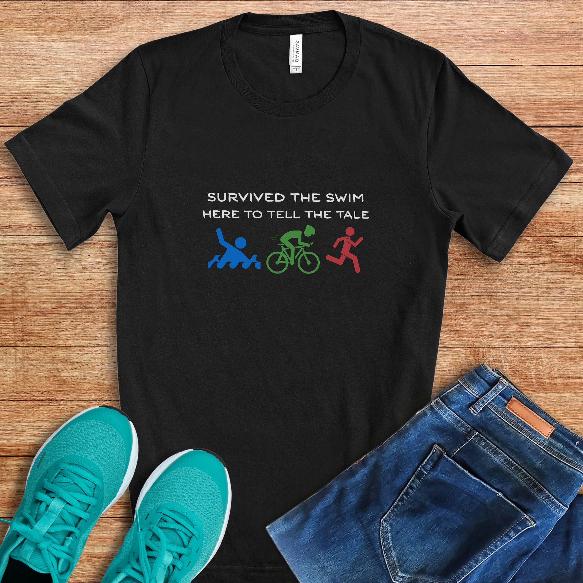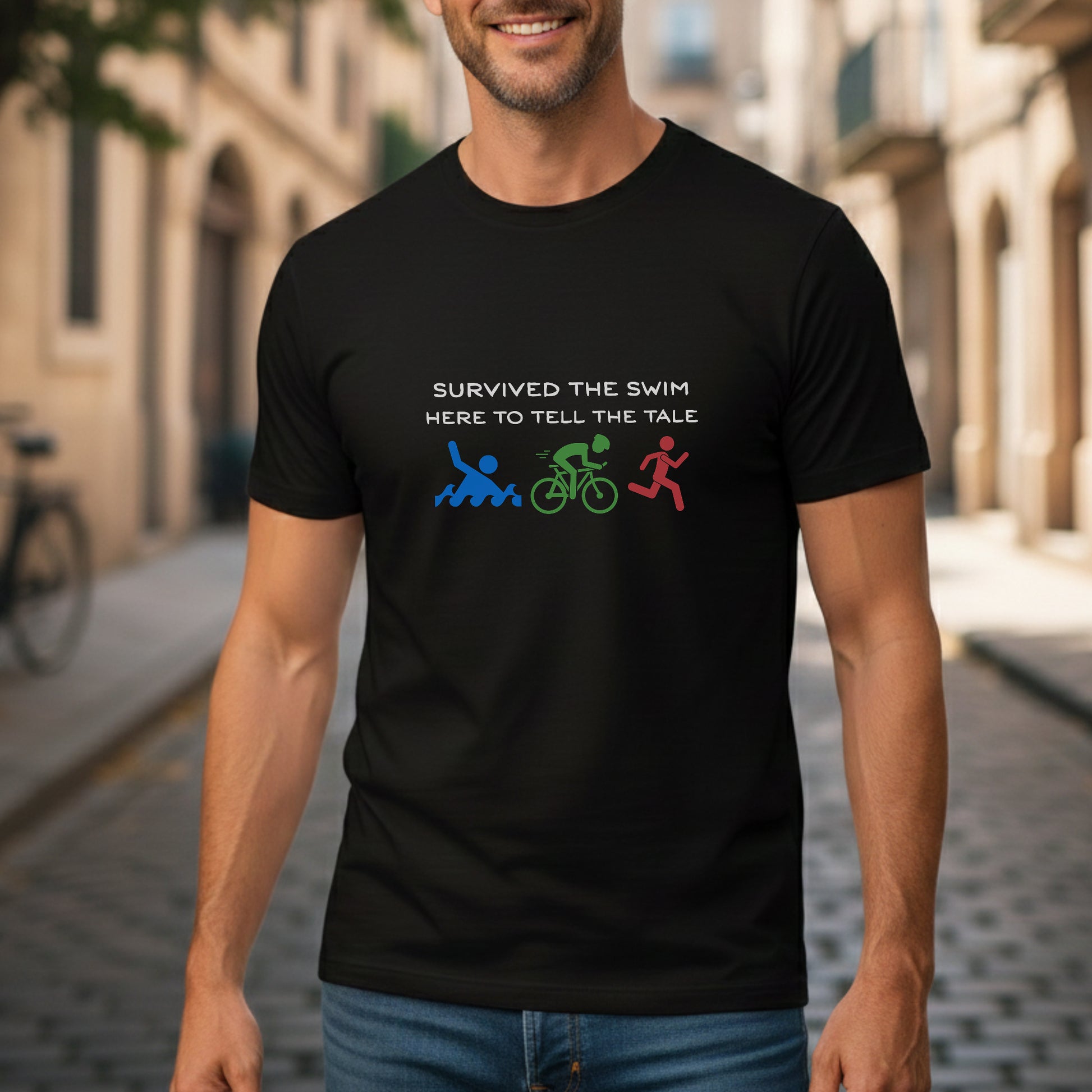 Have you survived the swim in a triathlon and can now tell that dramatic story? If so, this hilarious triathlon t-shirt is calling your name!