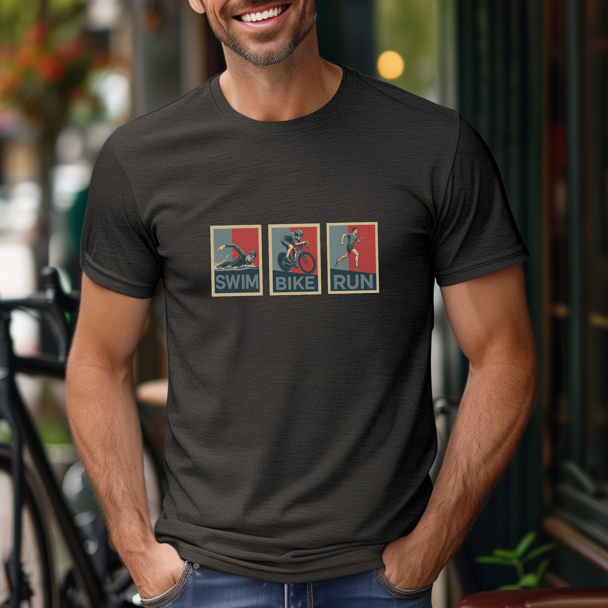 Simple and elegant, this triathlon poster has retro poster-style images of swim, bike and run. Let others know you love triathlon with this tri t-shirt!