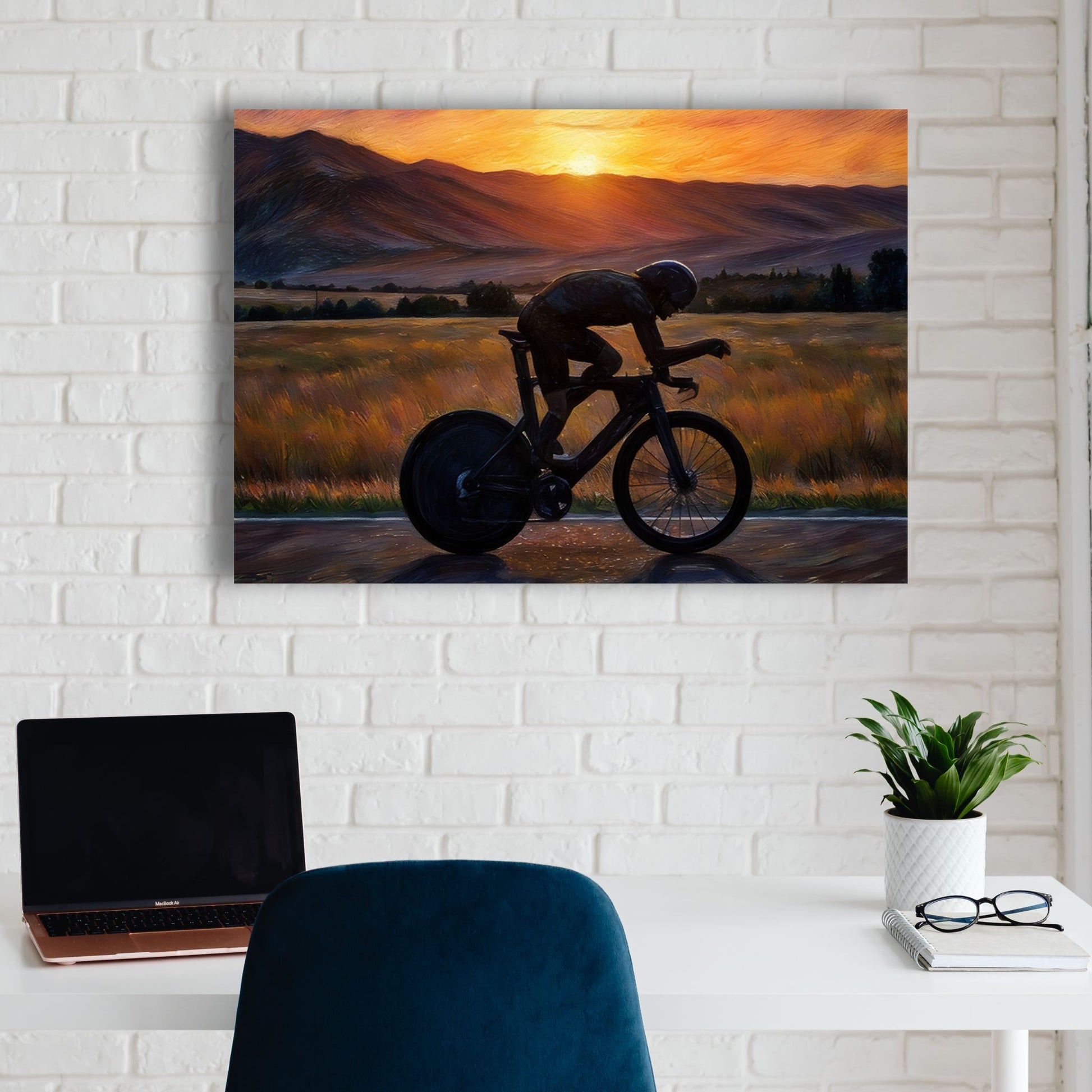 This beautiful scene, with a triathlete silhouetted against a setting sun, is the perfect piece of art for your office, home, or workout area. Be inspired by this triathlon art!